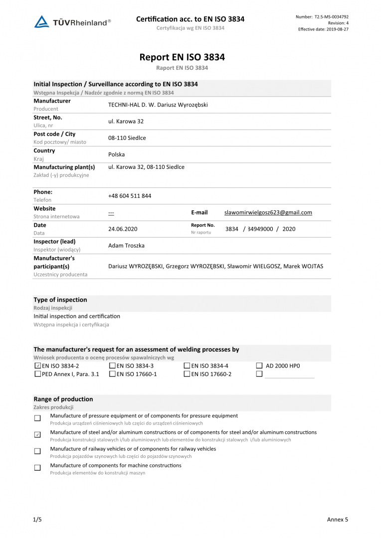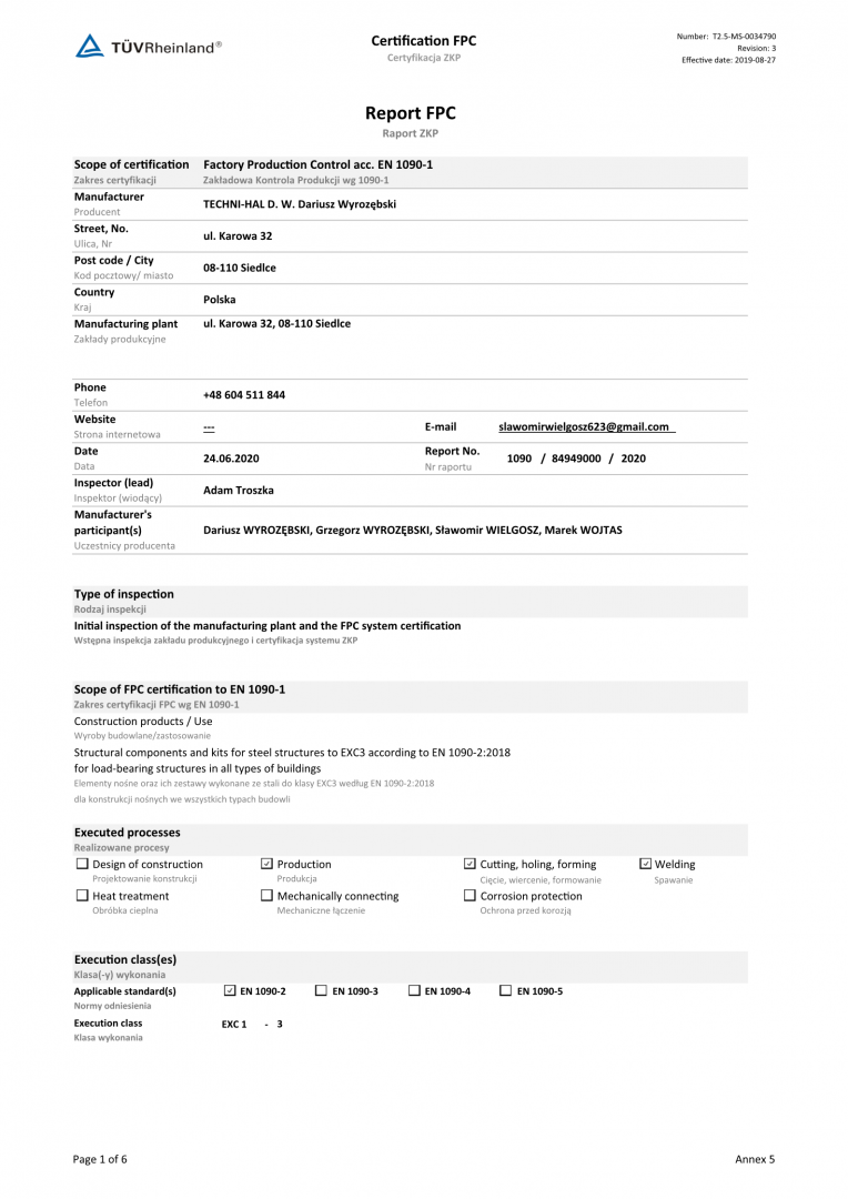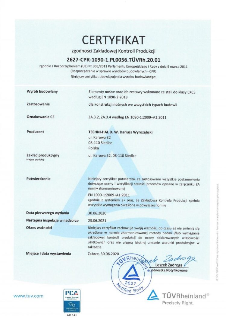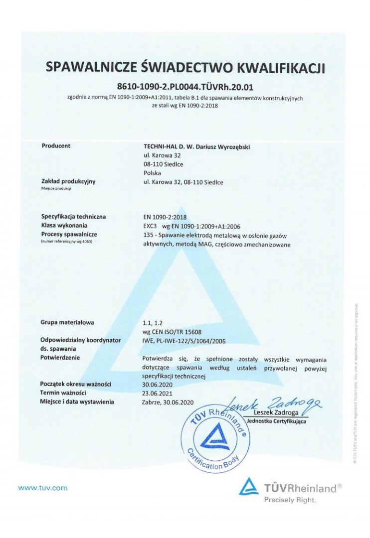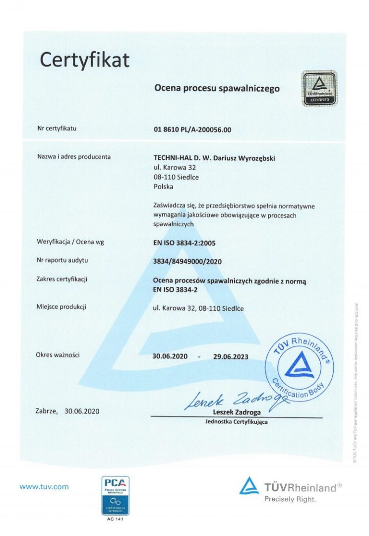 Posiadamy niezbędne certyfikaty, które potwierdzają nasze zaangażowanie w powierzone projekty: m.in. Certyfikat zgodności zakładowej Kontroli Produkcji, Spawalnicze Świadectwo kwalifikacji spawalniczej oraz Certyfikat oceny procesów spawalniczych.